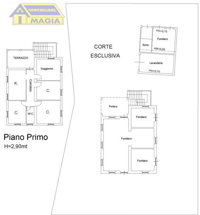 Il primo piano, sempre delle stesse dimensioni e raggiungibile al momento solo tramite scala esterna, è adibito ad appartamento composto da ingresso su corridoio, cucina abitabile, soggiorno, tre ampie camere da letto matrimoniali e bagno.