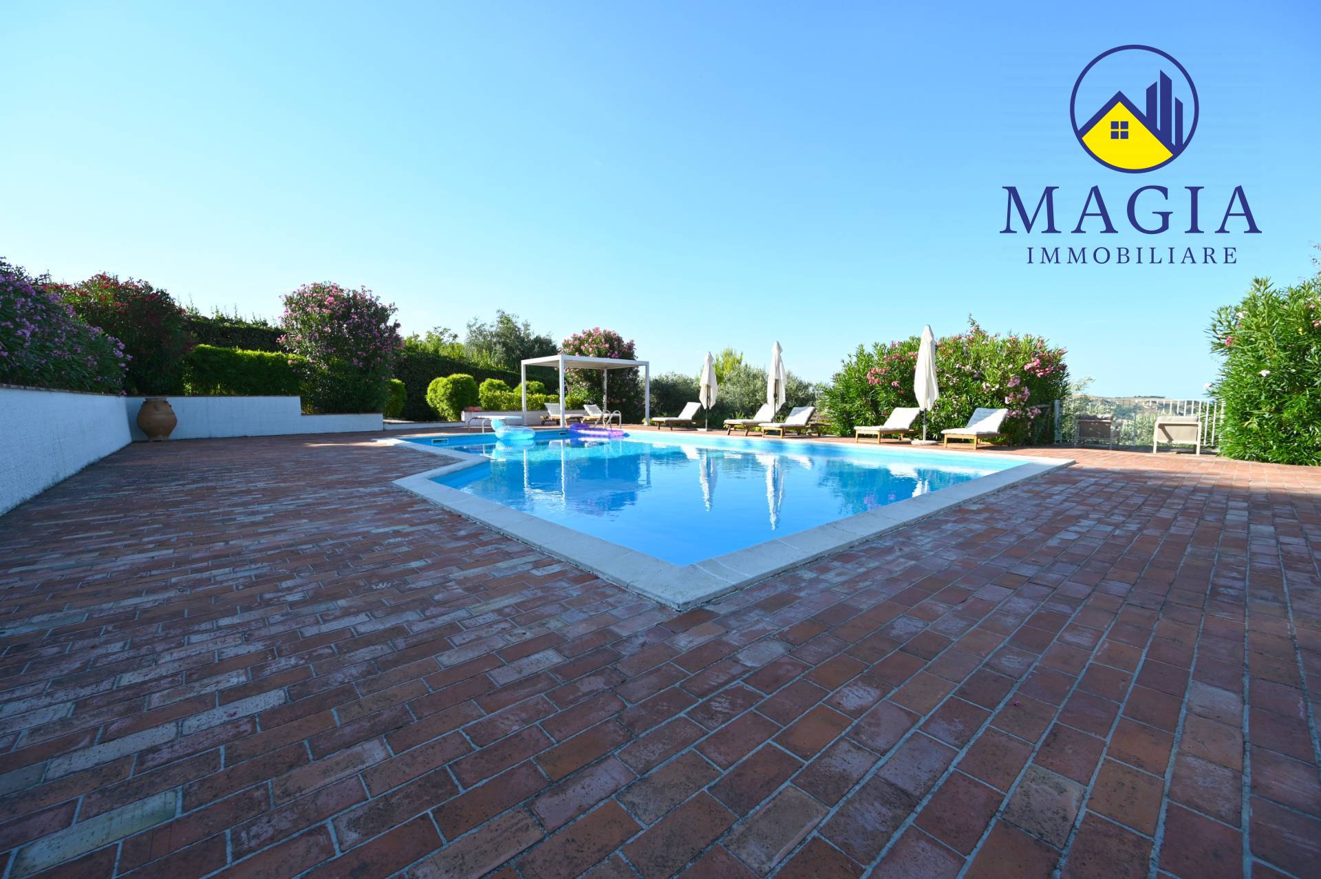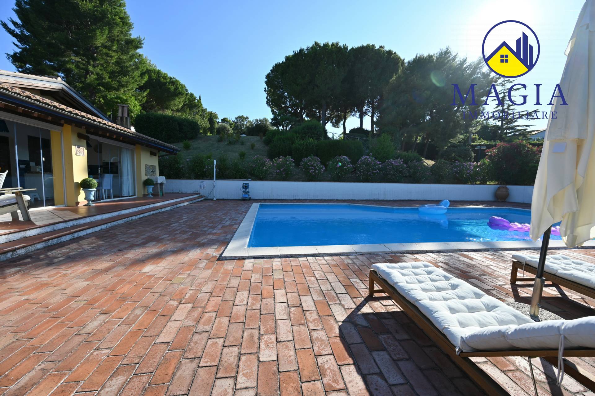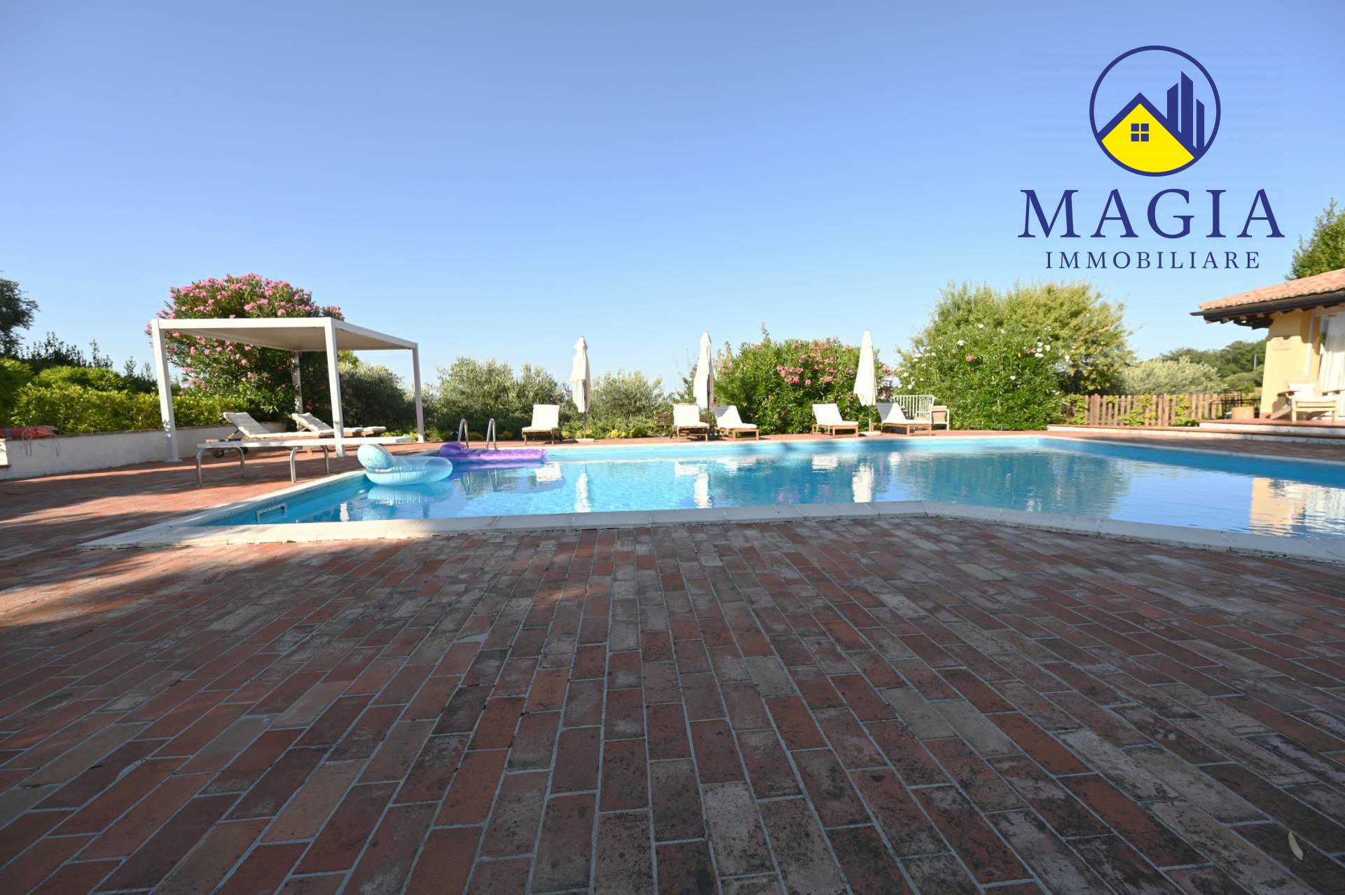 Il cuore della proprietà è la meravigliosa piscina, ideale per rilassarsi nelle giornate estive, immersi in un panorama naturale unico. Il terreno di circa 7.000 mq che circonda la Villa offre privacy, ampi spazi verdi e potenzialità per coltivazioni, orti, o area giochi.