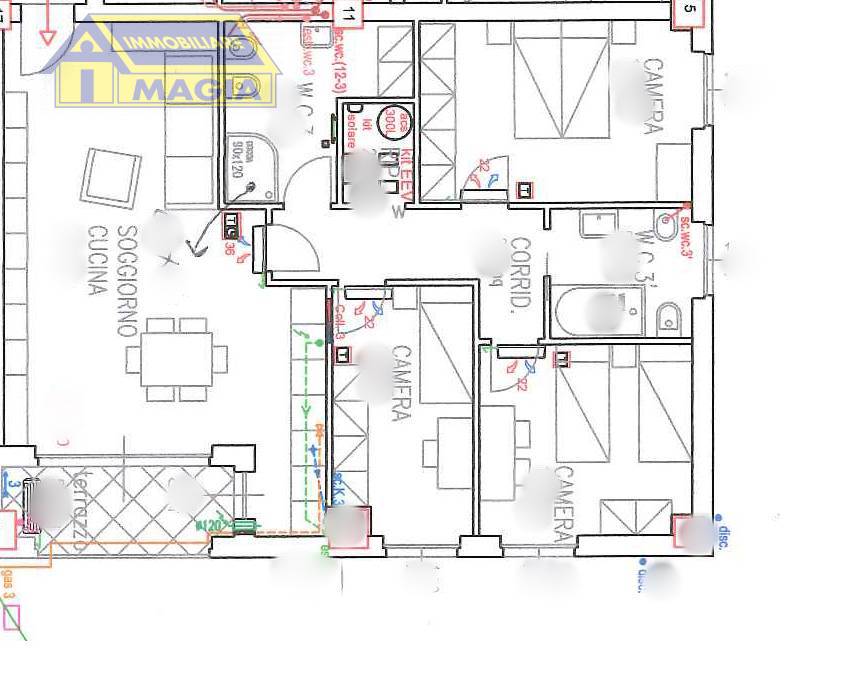 Appartamento di 91 mq circa, composto da: ingresso su soggiorno con cucina a vista, zona notte con disimpegno, camera e cameretta, due bagni e un terrazzo/balcone.