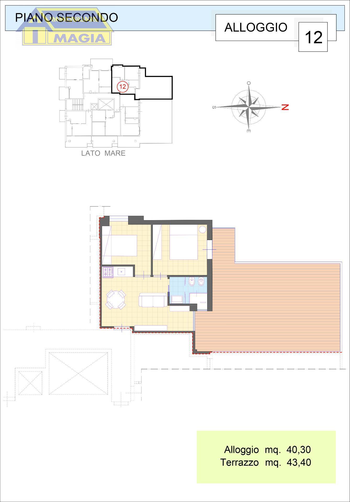 Appartamento di circa 40 mq composto di ingresso su soggiorno con cucina a vista, due camere, bagno e terrazzo di 43 mq. Esposizione Nord/Est/Ovest.
